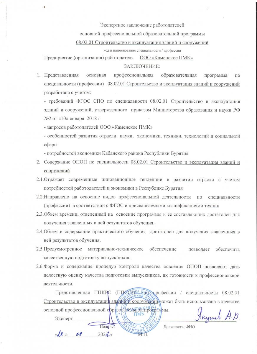 Приложение 1. Заключение о согласовании ППССЗ с ООО "Каменская ПМК"