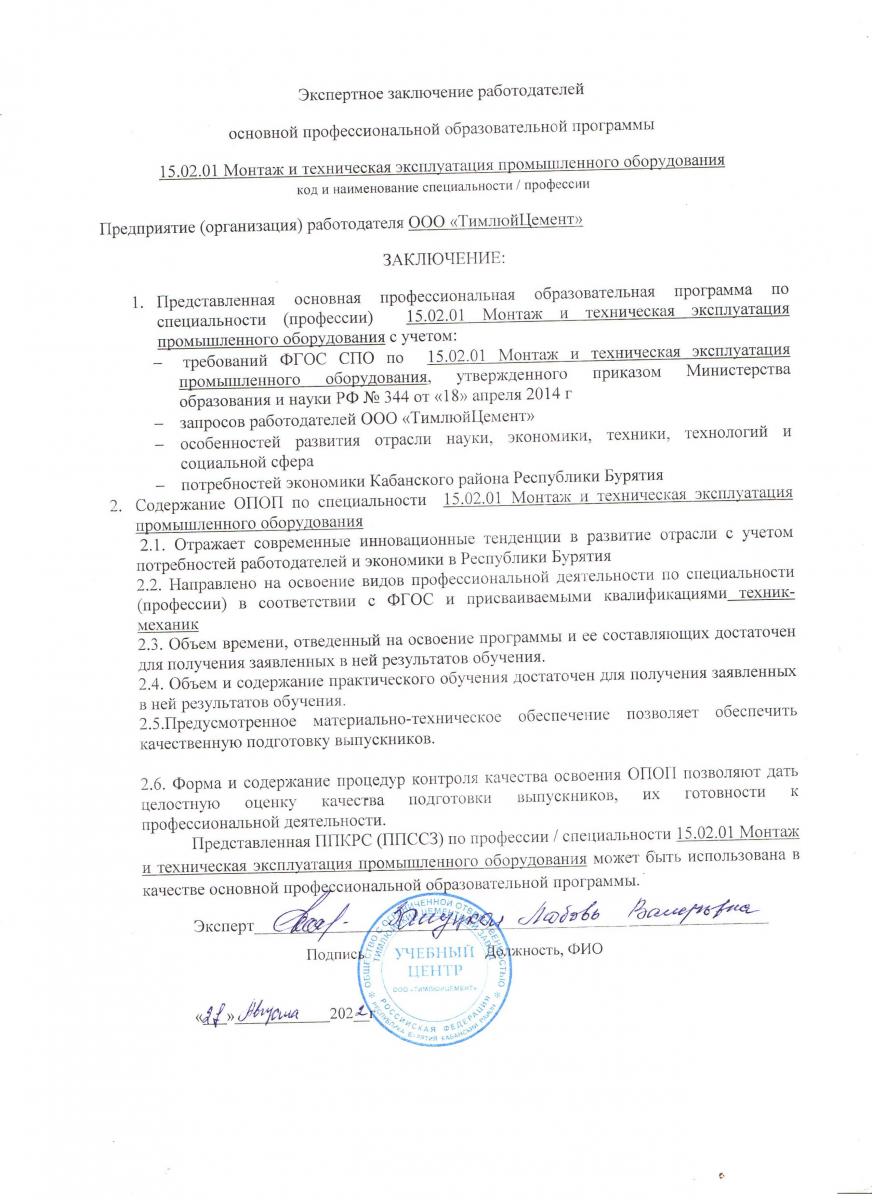 Приложение 1. Заключение о согласовании ППССЗ с ОАО "Селенгинский ЦКК"