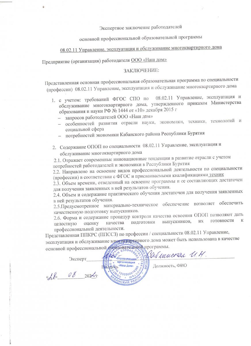Приложение 1. Заключение о согласовании ППССЗ с ООО "Наш дом"